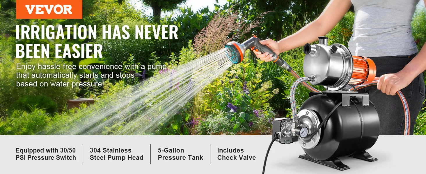 VEVOR 1176W Tuinpomp, 5600 L/U, Automatische irrigatiepomp met 50 m opvoerhoogte, Centrifugaalpomp met 30/50 PSI drukschakelaar, Ondiepe putpomp, Pompkop van roestvrij staal voor huis, tuin en gazon