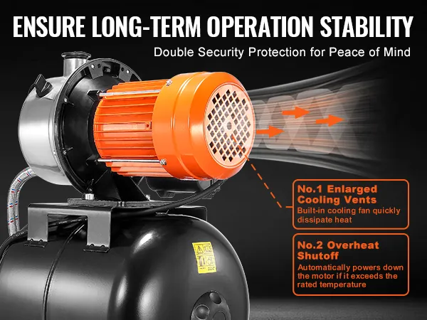 Deze ondiepe putpomp met tank is ontworpen met uitgebreide koelopeningen en een ingebouwde ventilator en zorgt voor een snelle warmteafvoer tijdens bedrijf. De automatische uitschakeling beschermt de motor tegen oververhitting en voorkomt zo mogelijke schade.