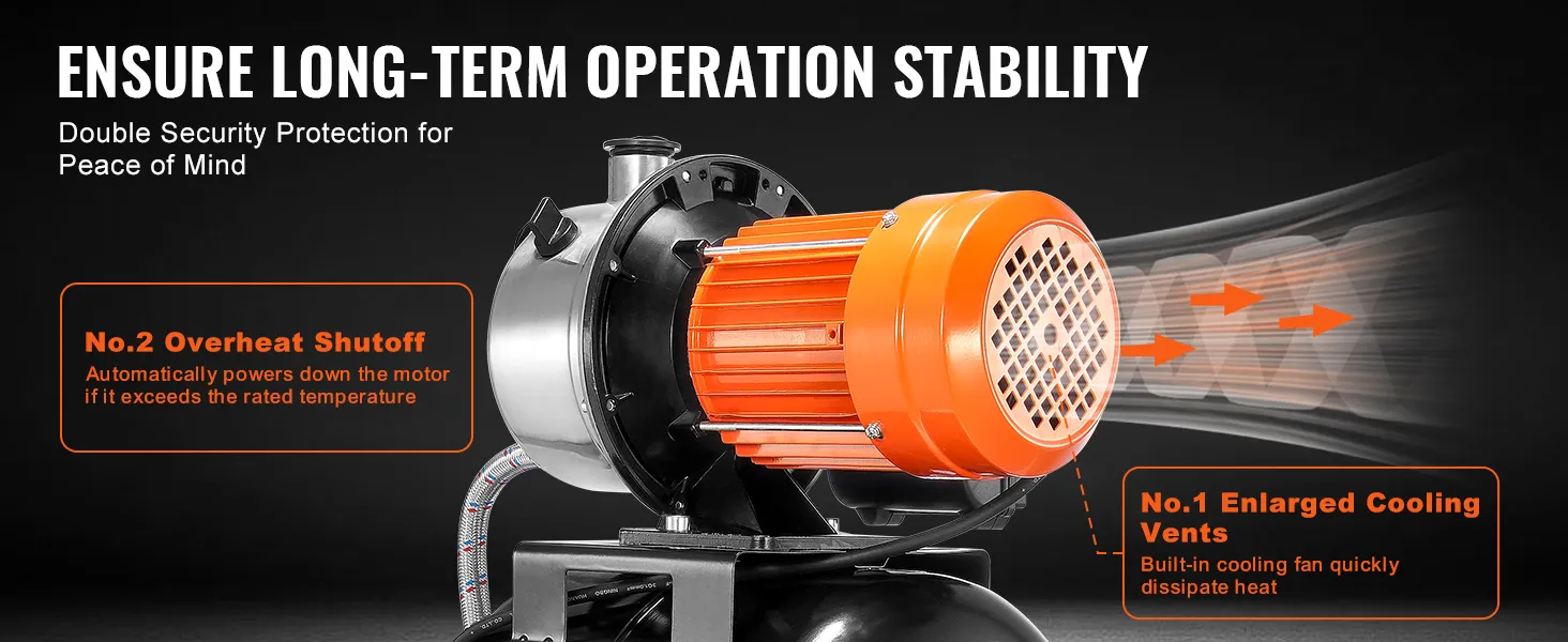 Verbeterde bescherming voor gemoedsrust: onze pomp is voorzien van een ingebouwde oververhittingsbeveiliging die de motor automatisch uitschakelt wanneer de temperatuur een veilig niveau overschrijdt, waardoor schade door oververhitting wordt voorkomen. Bovendien zorgen een aan de achterkant gemonteerde ventilator en grote ventilatieopeningen voor een effectieve warmteafvoer, zodat de pomp soepel blijft werken.