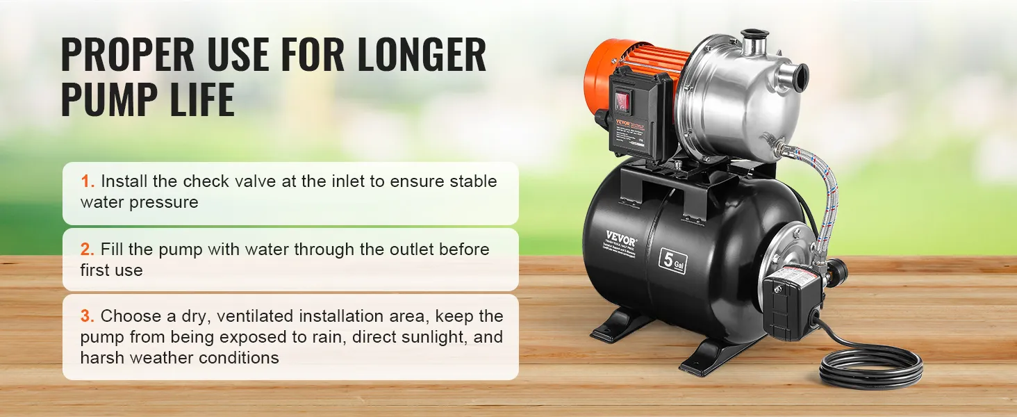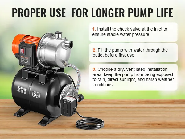 Doordachte accessoires: Om terugstroming te voorkomen en een stabiele waterdruk te behouden, leveren wij een terugslagklep bij uw ondiepe putpomp. Dit zorgt voor een probleemloze installatie: sluit eenvoudig uw slangen aan en gebruik uw pomp meteen. (Opmerking: Wanneer u de pomp voor de eerste keer gebruikt, zorg er dan voor dat u de pomp via de uitlaatpoort met water vult om schade door drooglopen te voorkomen.)