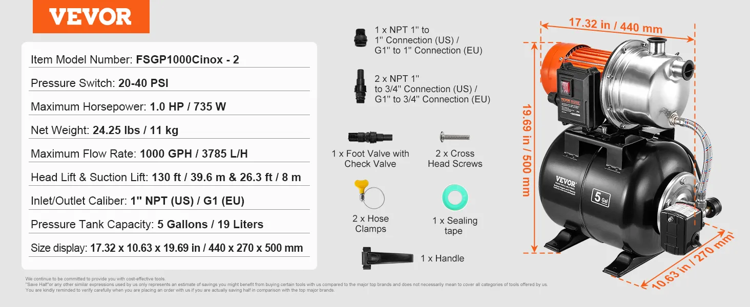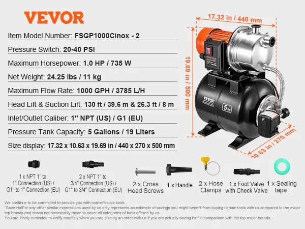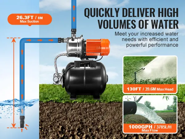 Zeer efficiënte watertoevoer: Uitgerust met een motor van 1,0 pk (735 W), levert onze ondiepe putpomp met druktank een maximaal debiet van 3785 l/u (1000 GPH), een opvoerhoogte tot 39,6 m (130 voet) en een zuigdiepte van 8 m (26,3 voet). Ideaal voor het verpompen van water over lange afstanden met indrukwekkende efficiëntie.