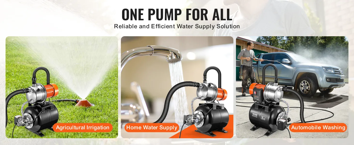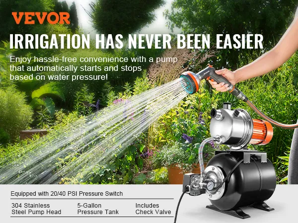 Ideaal voor landbouwirrigatie, huishoudelijke watervoorziening, industrieel gebruik en commerciële systemen. Onze druktank-tuinpomp heeft een stabiele druk en stroom, waardoor hij ideaal is voor efficiënte irrigatie.