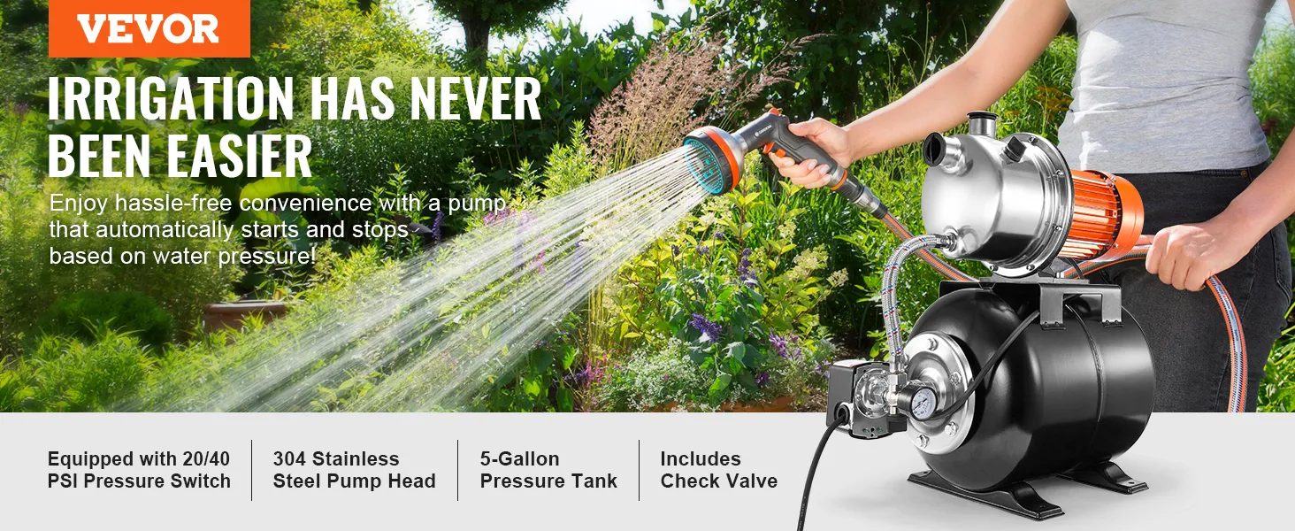 VEVOR 735W tuinpomp, 3785 l/u, automatische irrigatiepomp met 39,6 m opvoerhoogte, centrifugaalpomp met 20/40 PSI drukschakelaar, ondiepe putpomp, roestvrijstalen pompkop voor huis, tuin en gazon