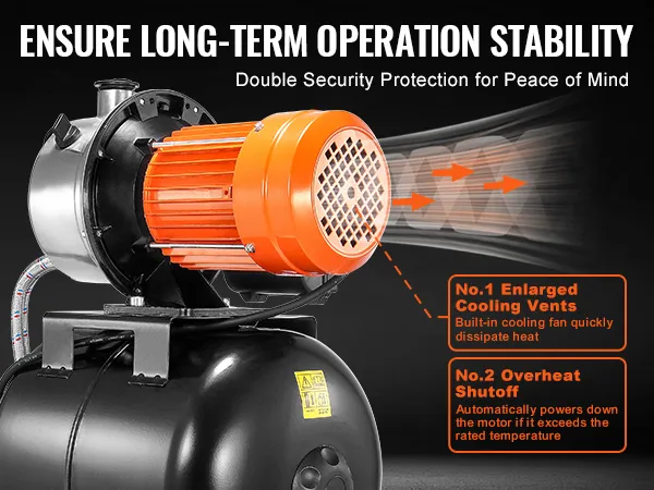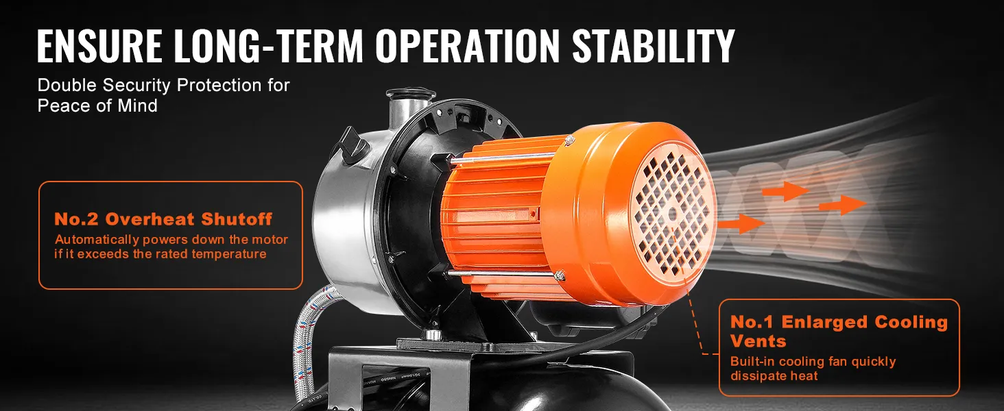 Verbeterde bescherming voor gemoedsrust: onze pomp is voorzien van een ingebouwde oververhittingsbeveiliging die de motor automatisch uitschakelt wanneer de temperatuur een veilig niveau overschrijdt, waardoor schade door oververhitting wordt voorkomen. Bovendien zorgen een aan de achterkant gemonteerde ventilator en grote ventilatieopeningen voor een effectieve warmteafvoer, zodat de pomp soepel blijft werken.