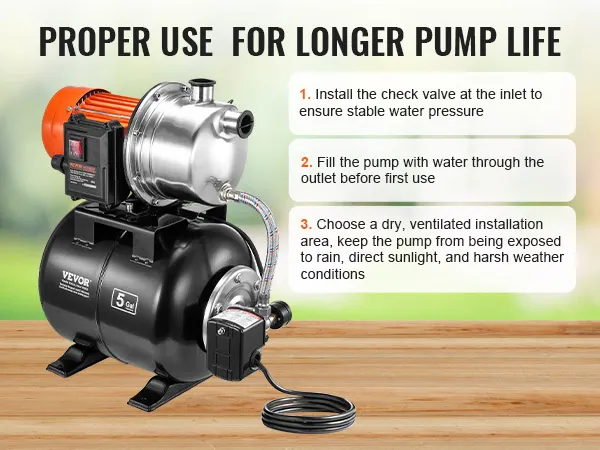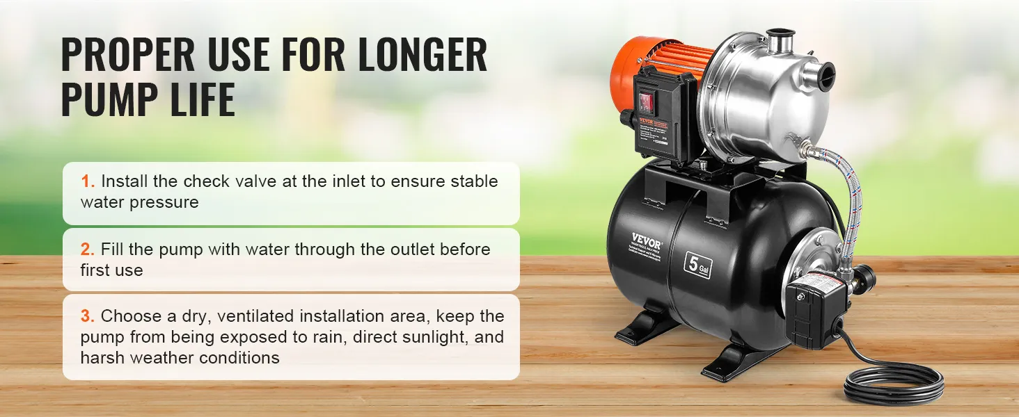 Doordachte accessoires: Om terugstroming te voorkomen en een stabiele waterdruk te behouden, leveren wij een terugslagklep bij uw ondiepe putpomp. Dit zorgt voor een probleemloze installatie: sluit eenvoudig uw slangen aan en gebruik uw pomp meteen. (Opmerking: Wanneer u de pomp voor de eerste keer gebruikt, zorg er dan voor dat u de pomp via de uitlaatpoort met water vult om schade door drooglopen te voorkomen.)