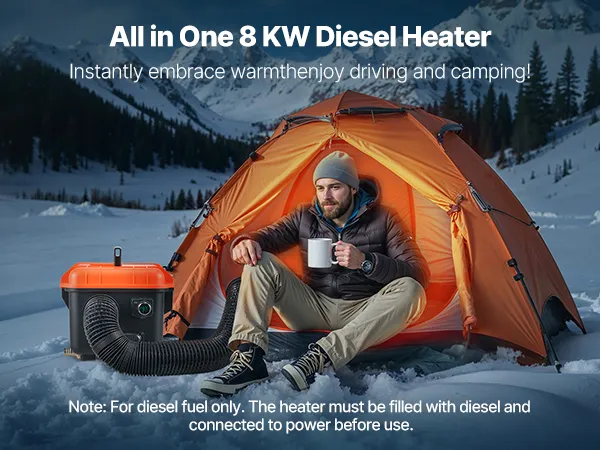 This 8KW portable diesel heater connects to a vehicle power and includes an adapter for power stations or household AC power. It delivers fast and efficient heating for tents, ice fishing, RVs, trucks, SUVs, vans, and more. Designed to handle cold environments, it quickly warms large spaces.