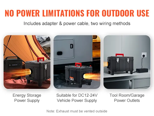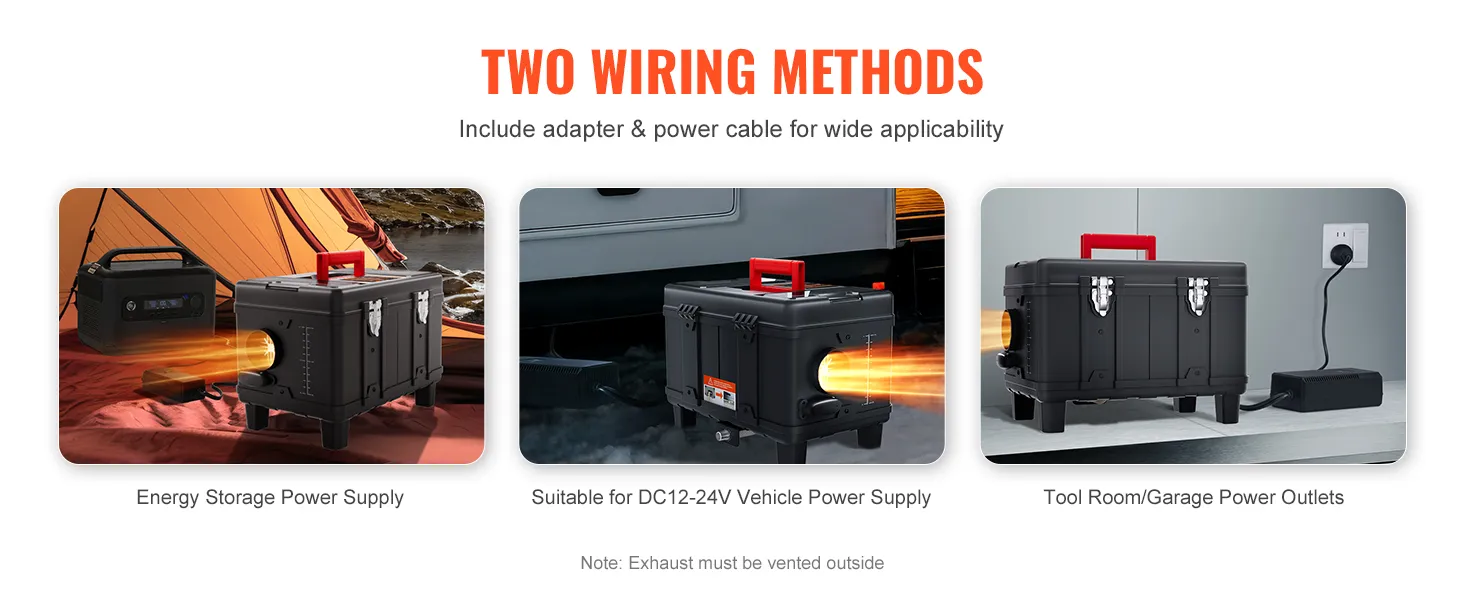 Brede compatibiliteit (DC 12-24V): De dieselluchtverwarmer wordt geleverd met twee bedradingsopties - adapter en DC 12V - waardoor hij plug-and-play is voor veelzijdig gebruik. Het is geschikt voor stopcontacten, DC 12/24V voertuigaccu's of buitenenergiecentrales en zorgt voor warmte in auto's, campers, vrachtwagens, tractoren, garages, hutten en zelfs bij kamperen buiten.