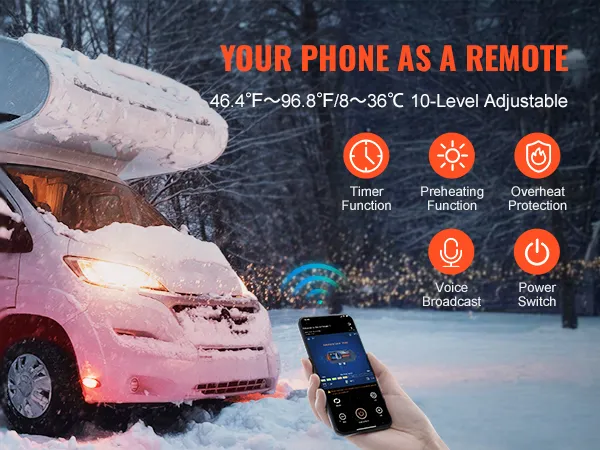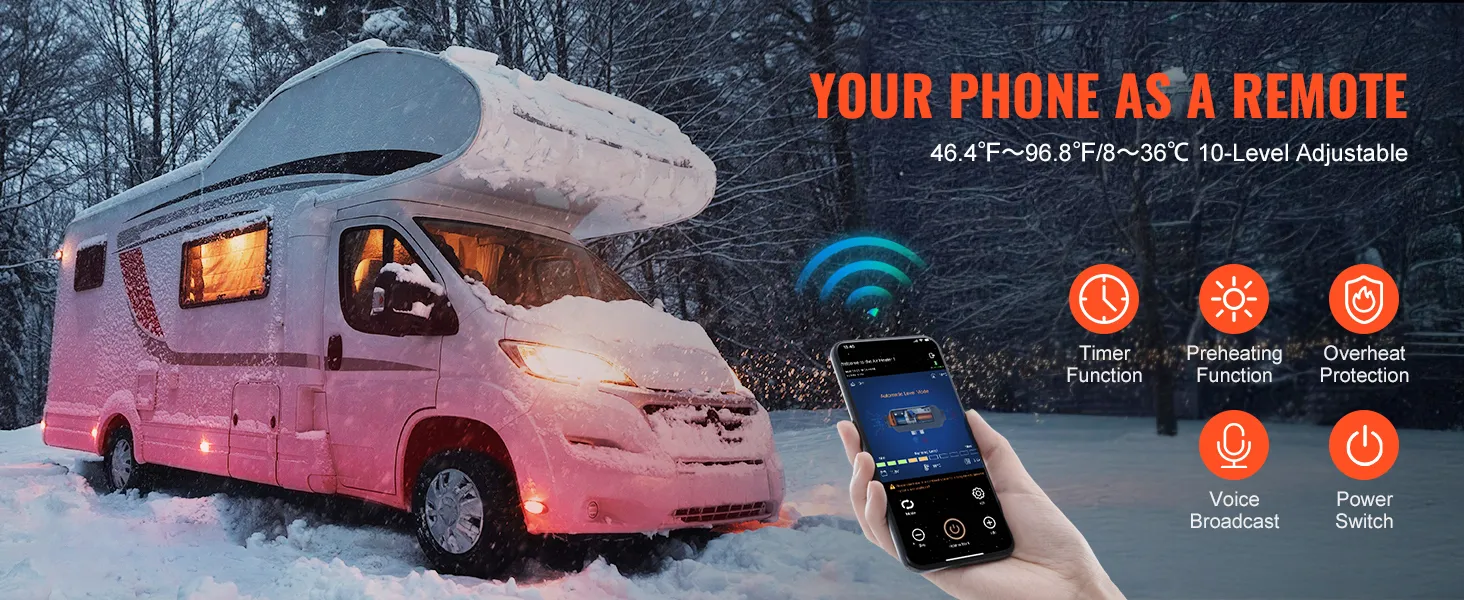Intelligente bedieningsopties: onze dieselautoverwarming is uitgerust met 3 bedieningsmethoden: Bluetooth-app, afstandsbediening en displaypaneel. U kunt uw verwarming rechtstreeks vanaf uw smartphone bedienen en monitoren. Pas eenvoudig de temperatuurinstellingen aan voor een intuïtieve en comfortabele verwarmingservaring.