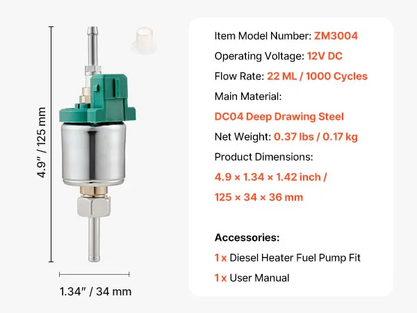 Enhanced Performance: With pulse-driven precision, VEVOR car air heater diesel fuel dosing pump delivers 22 mL every 1000 strokes. It helps maintain a steady fuel flow, supporting your diesel heater's overall performance across a variety of usage conditions
