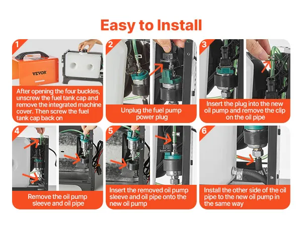 Our diesel heater oil fuel pump is engineered for simple setup. With only 6 basic steps, you can easily replace your old unit. Be sure to remove the damaged pump completely before installation and ensure all clamps and tubing are properly connected.