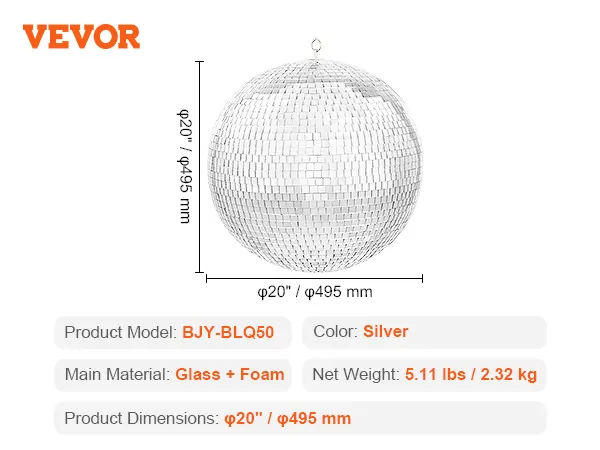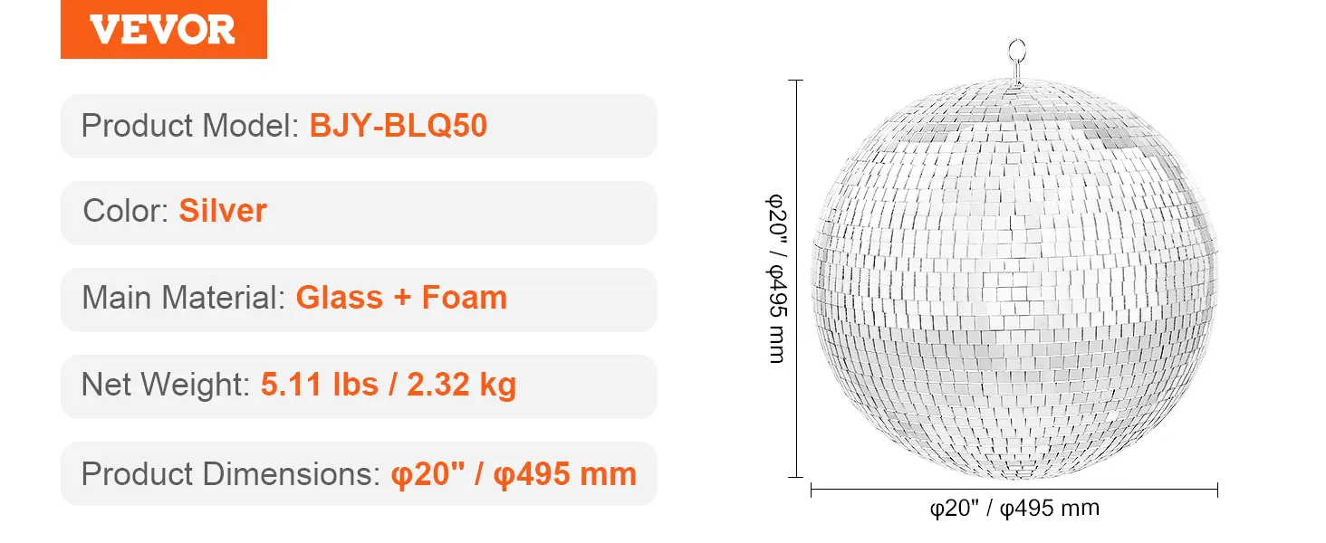 VEVOR Mirror Disco Ball, Large 20 Inch Party Mirror Ball with Hanging Ring, Lightning Disco Ball Party Decorations, Ideal for DJ Club, Stage, Wedding, Birthday, Christmas, New Years Celebration