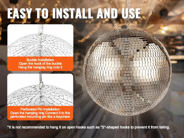 Easy Installation: Our 20 in/495 mm party mirror ball comes with a pre-installed O ring on the top of the ball, which provides a secure and safe hanging to prevent balls from falling and causing damages. It can be easily hang on any ceiling walls with a hook, or electronic rotating motor (Sold/Purchase Separately)—no hassle, just fun!