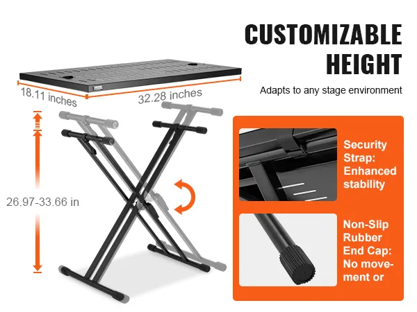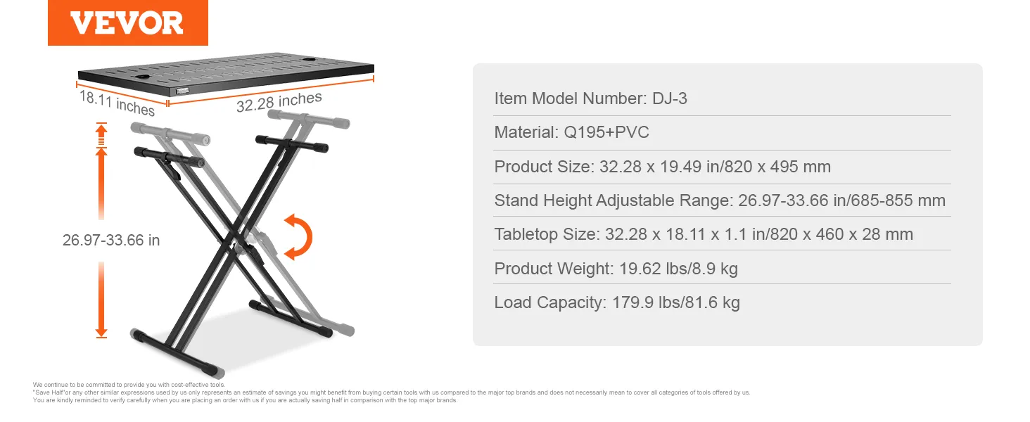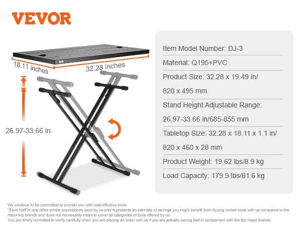 VEVOR DJ-tafelstandaard, 32" x 20" draagbare DJ-laptop- en controllerstandaard, lichtgewicht DJ-bureau, DJ-booth, in hoogte verstelbare DJ-standaard, opvouwbare keyboardstandaard met dubbele X-beugels en tafelblad, audiomixerstandaard