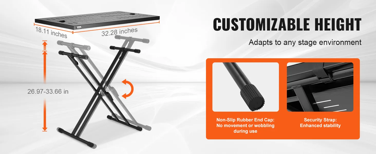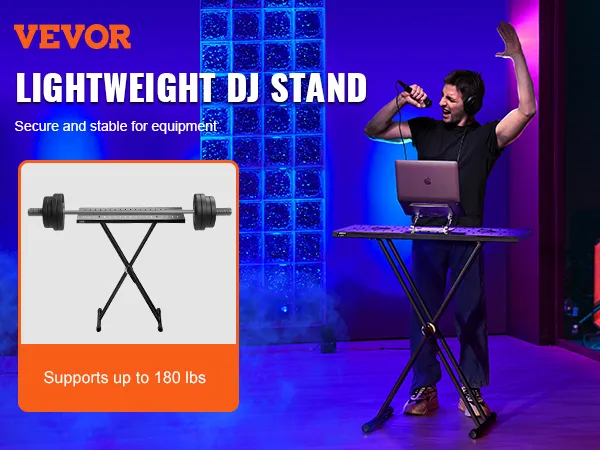 Hoge sterkte en duurzaamheid: onze DJ-tafelstandaard is gemaakt van stevig gelegeerd staal en zorgt voor uitzonderlijke stabiliteit en duurzaamheid. Hij ondersteunt comfortabel meerdere audioapparaten met een gewicht tot 81,6 kg, zonder te buigen. De vergrendelhandgreep verbetert de stabiliteit en minimaliseert wiebelen voor een betrouwbare gebruikerservaring.