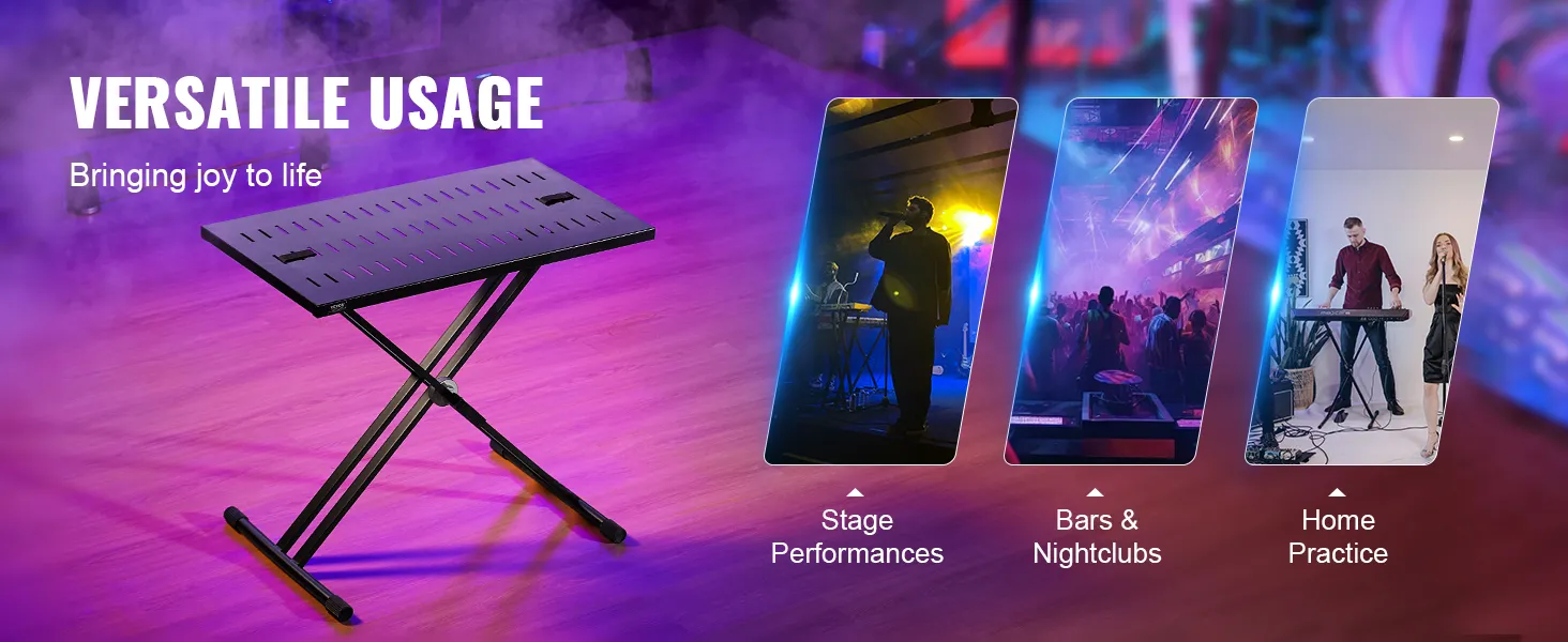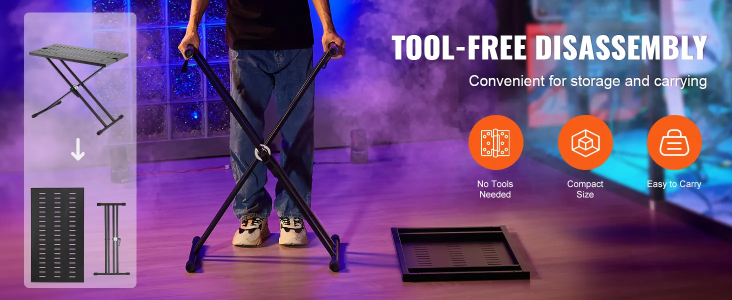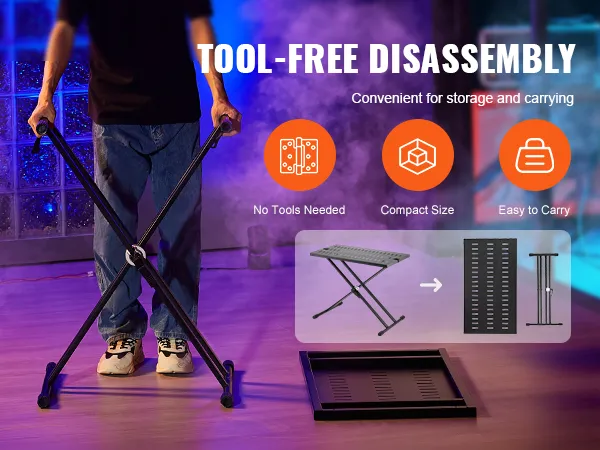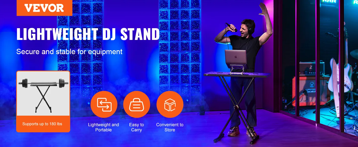 Eenvoudig op te zetten en mee te nemen: onze DJ-standaard is ontworpen met een X-vormige draagstructuur en gladde connectoren en kan moeiteloos worden op- en uitgevouwen. Het bevat een gedetailleerde lijst met accessoires en instructies voor eenvoudige montage zonder gereedschap. Hij kan netjes worden opgevouwen en kan worden opgeborgen en vervoerd in een draagtas, waardoor hij gemakkelijk op te bergen is tijdens elk evenement.