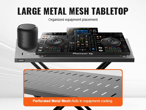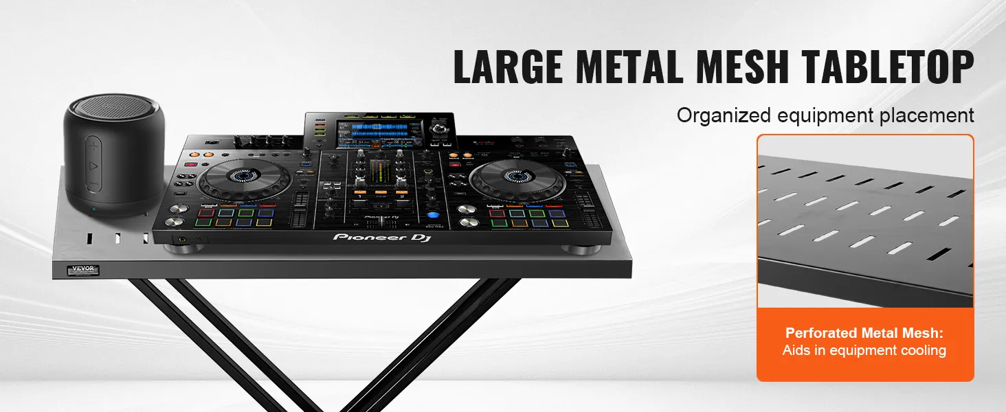 Ruim werkoppervlak: met een royaal tafelblad van metaalgaas (32,28 x 19,49 inch / 820 x 495 mm) biedt deze DJ-tafel comfortabel plaats aan uw computer, mixer, DJ-controllers en andere audioapparatuur. Het mesh-ontwerp verbetert de warmteafvoer en zorgt voor een opgeruimde, aantrekkelijke werkruimte voor een betere publiekservaring.