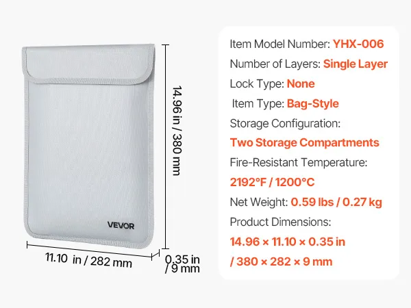 Deze brandwerende documententas is bestand tegen temperaturen tot 1200 °C en is water- en stofbestendig. Met een gewicht van slechts 0,27 kg biedt hij voldoende opbergruimte voor dossiers en apparatuur. De verbeterde, waterbestendige rits houdt spullen droog, waardoor de tas ideaal is voor thuis, op kantoor of op reis.