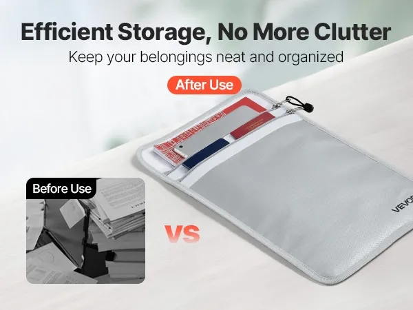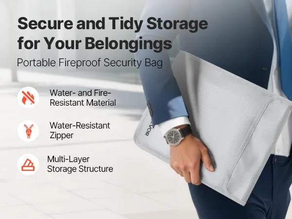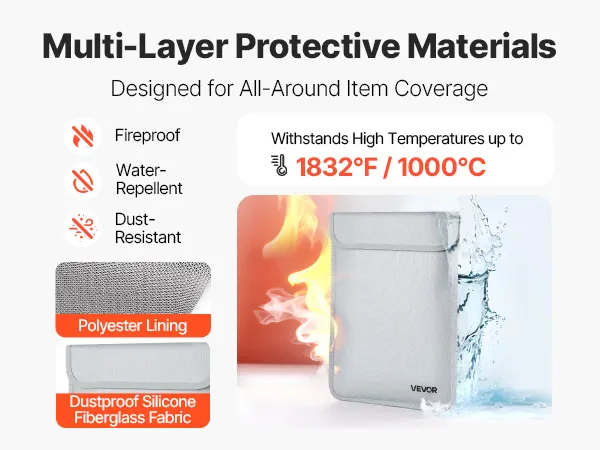 Brandveilig en waterdicht materiaal: deze brandveilige documententas is gemaakt van vlamvertragend siliconen- en aluminiumfolieglas en is bestand tegen temperaturen tot 1200°C (2192°F). Zo worden uw documenten, geld en elektronica beschermd tegen brand- en watergevaren.