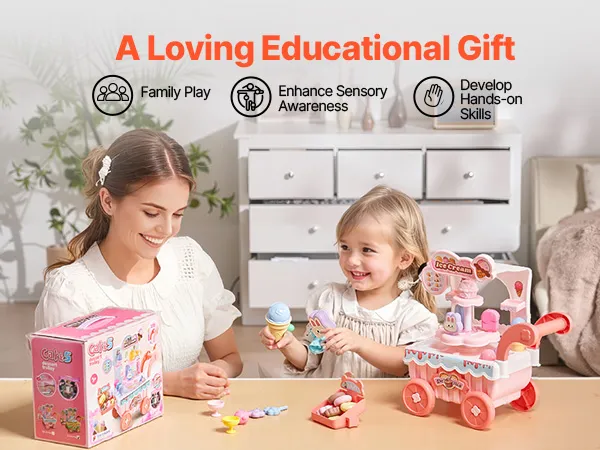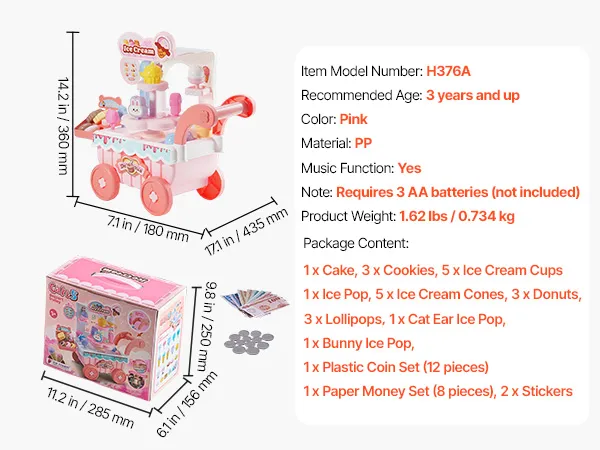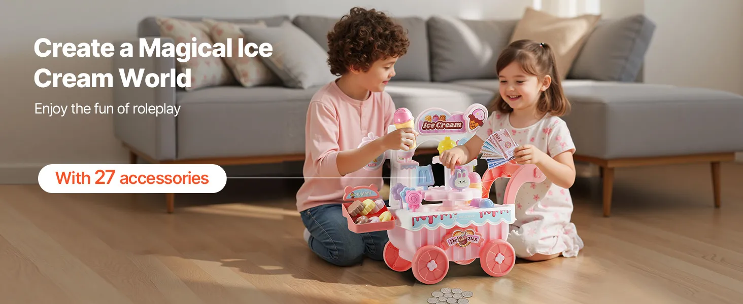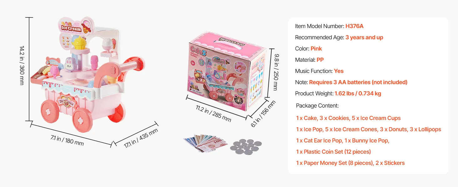 Gemakkelijk te verplaatsen: Dankzij het comfortabele handvat en de soepel lopende wielen kunnen kinderen het ijskarretje overal naartoe duwen! Of het nu binnen of buiten is, ze zullen genieten van het doen alsof ze ijs verkopen en winkeltje spelen met vrienden
