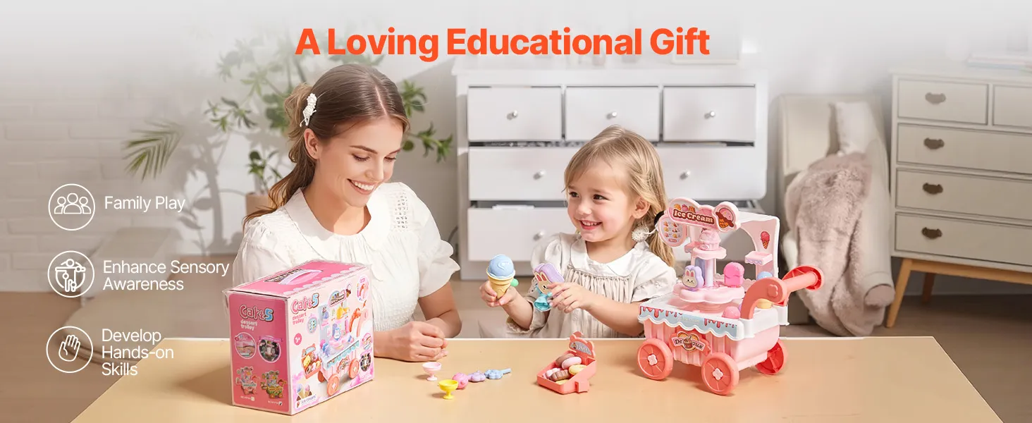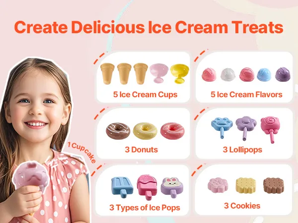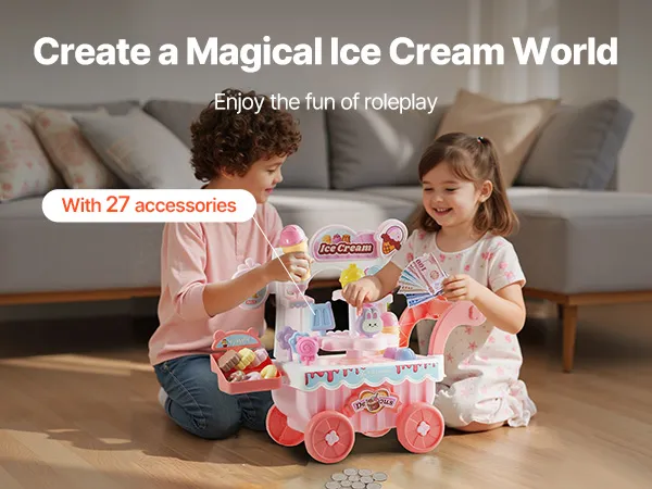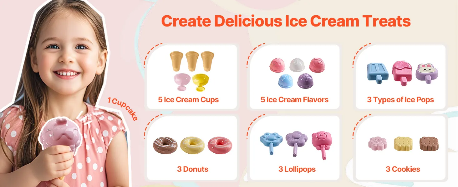 Onze speelgoedijscowagen bestaat uit 27 leuke onderdelen: hoorntjes, bolletjes, ijsjes en nog veel meer! Kinderen kunnen de meest fantastische ijscombinaties mixen, matchen en creëren en hun heerlijke ideeën tot leven brengen met grenzeloze creativiteit.