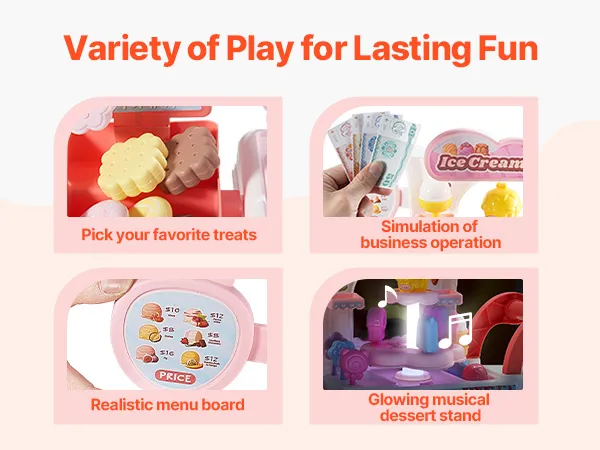 Meer dan alleen een ijscowagen! Kinderen kunnen winkeltje spelen, nieuwe smaken ontdekken of lekkernijen serveren. De draaiende, oplichtende dessertkraam met muziek maakt elk spel extra leuk!
