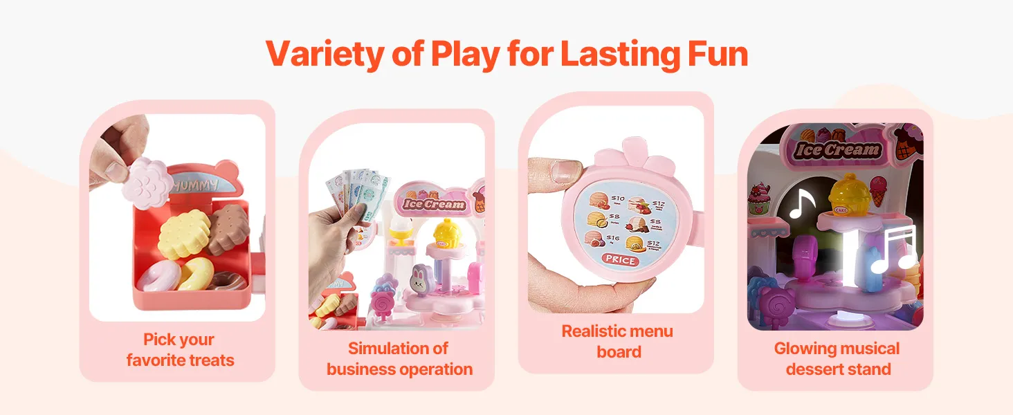 Met leuke accessoires en een realistische display verandert deze speelset met ijskraam kinderen in kleine ijsverkopers! Ze zullen het geweldig vinden om in hun eigen dessertwinkel zoetigheden te scheppen, te serveren en te verkopen.