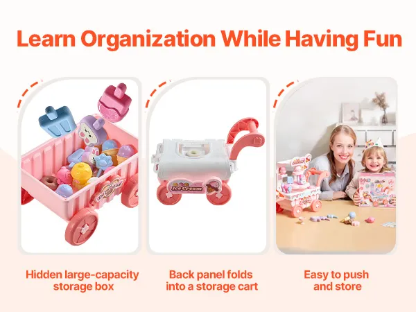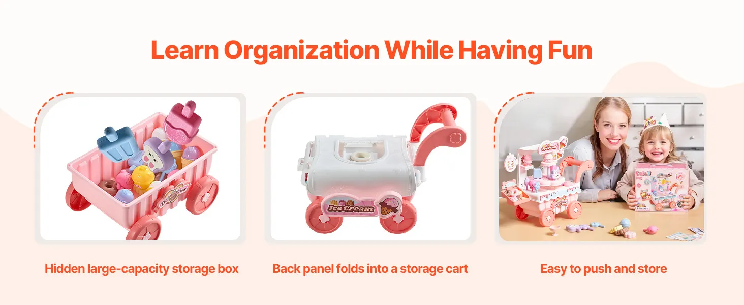 Geen speelgoedchaos meer! De ijssalon dient tevens als opslagplaats en zorgt voor orde. Dankzij de handgreep is de set makkelijk te duwen en het achterpaneel kan worden ingeklapt tot een opbergkarretje, zodat je georganiseerd kunt spelen.