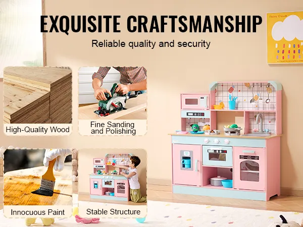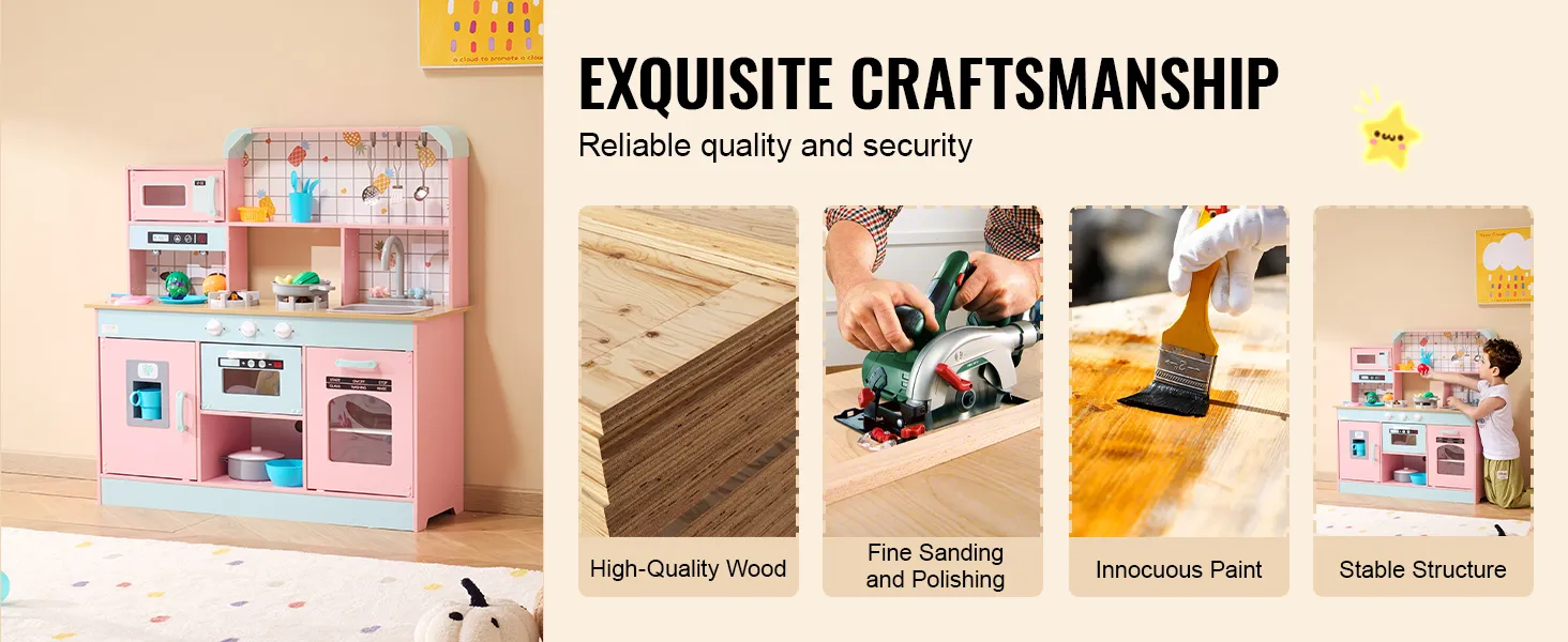 We use high-quality wood and innocuous paint to ensure our kids kitchen playset is safe for your child. With smooth finishes and sturdy construction, you can feel confident letting your little one enjoy hours of play.