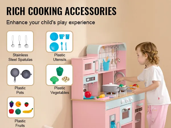 24 Rich Accessories: Our play kitchen includes everything your little chef needs: 3 stainless steel spatulas, a stew pot, a frying pan, a cutting board, a fruit knife, a vegetable basket, a bowl, a basin, a water cup, an ice maker cup, a spoon, a fork, a knife, and 9 lifelike fruits and veggies. These accessories make learning about colors, hand-eye coordination, and cooking fun and engaging.