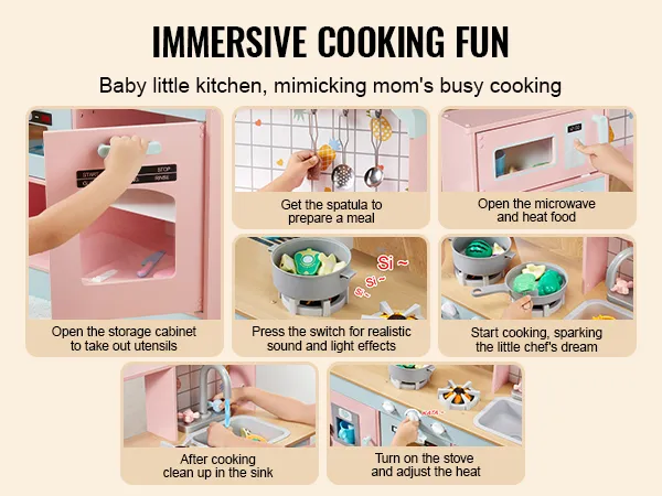 Realistic Kitchen Set: Dive into a world of fun with our wooden play kitchen! Designed to mimic real-life activities, this play kitchen features a stove with realistic lights and sounds, a sink, a washing machine, an oven, an ice maker, and a microwave. It's perfect for sparking creativity, improving fine motor skills, and encouraging teamwork as kids cook up delicious meals.
