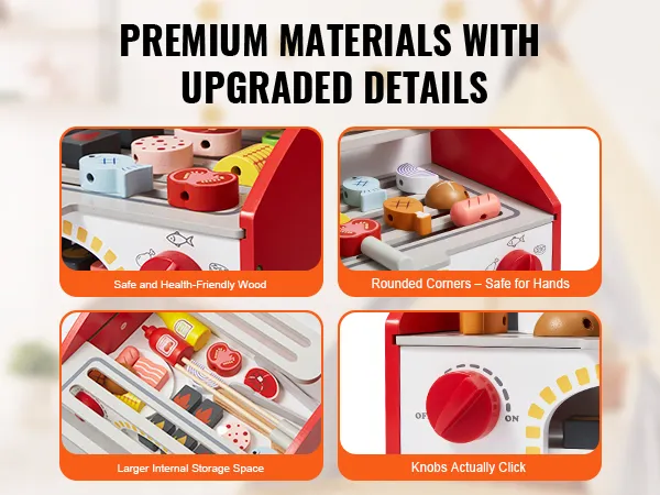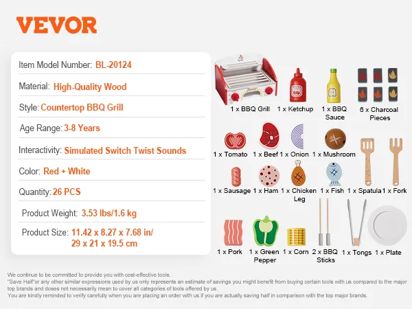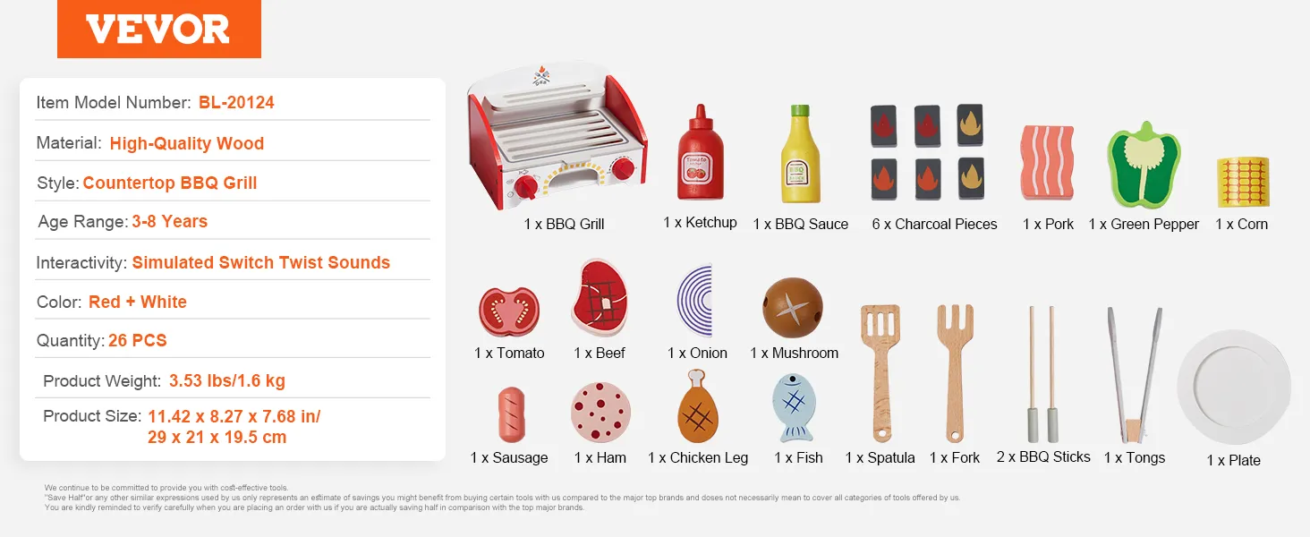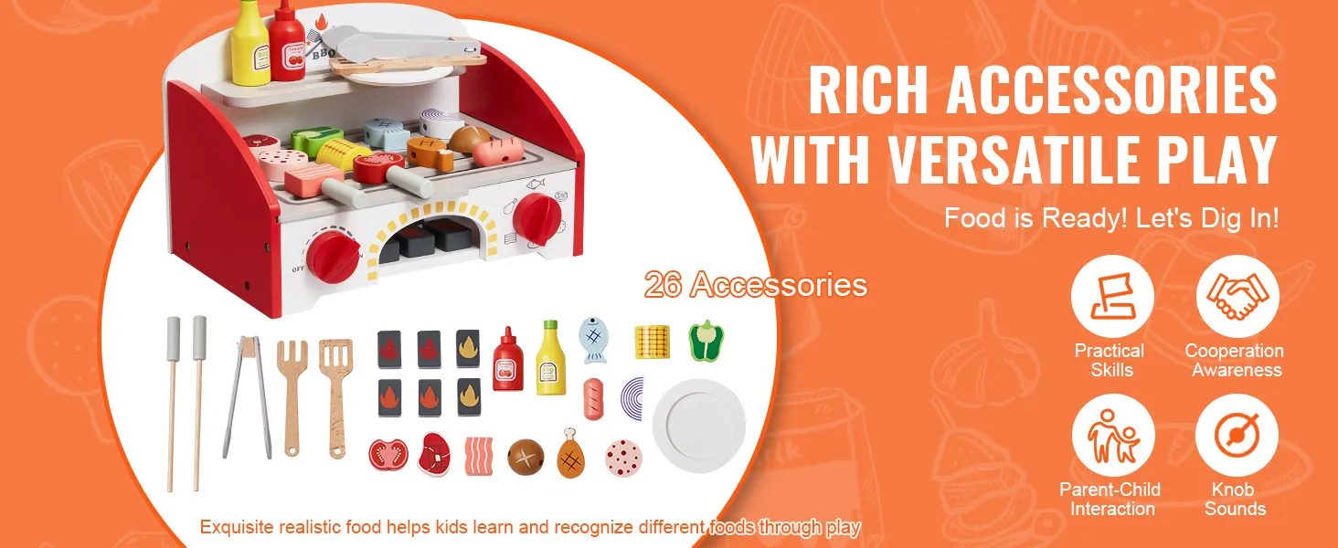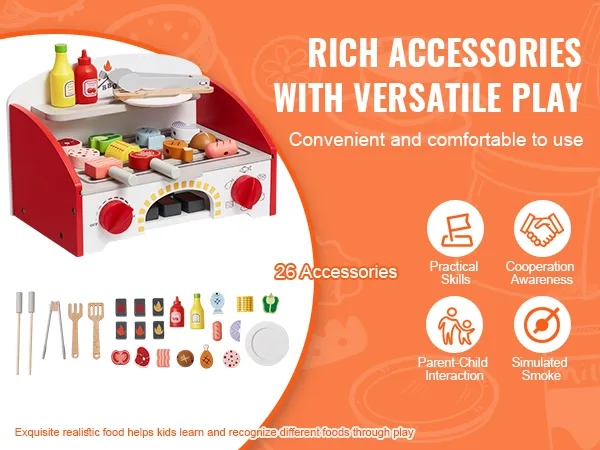 VEVOR Grillspeelset voor kinderen, houten grillspeelset met realistisch kolenvuur, houten keukenaccessoires voor fantasievoedsel (26 stuks), rollenspelspeelgoed voor kinderen vanaf 3 jaar