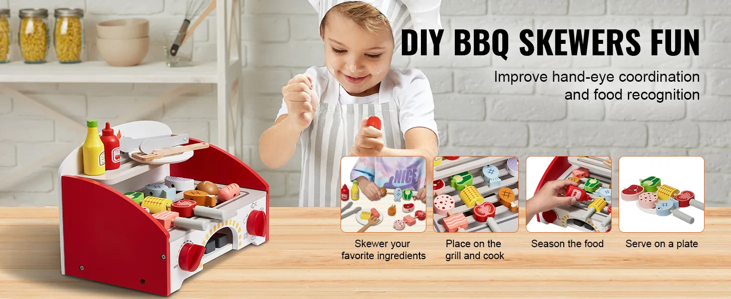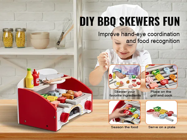 Deze grillspeelset voor kinderen helpt kinderen de hand-oogcoördinatie te ontwikkelen en meer te leren over grillen en verschillende soorten voedsel. Perfect om alleen of met vrienden te spelen, het stimuleert het ontwikkelen van vaardigheden en het leren door te spelen.