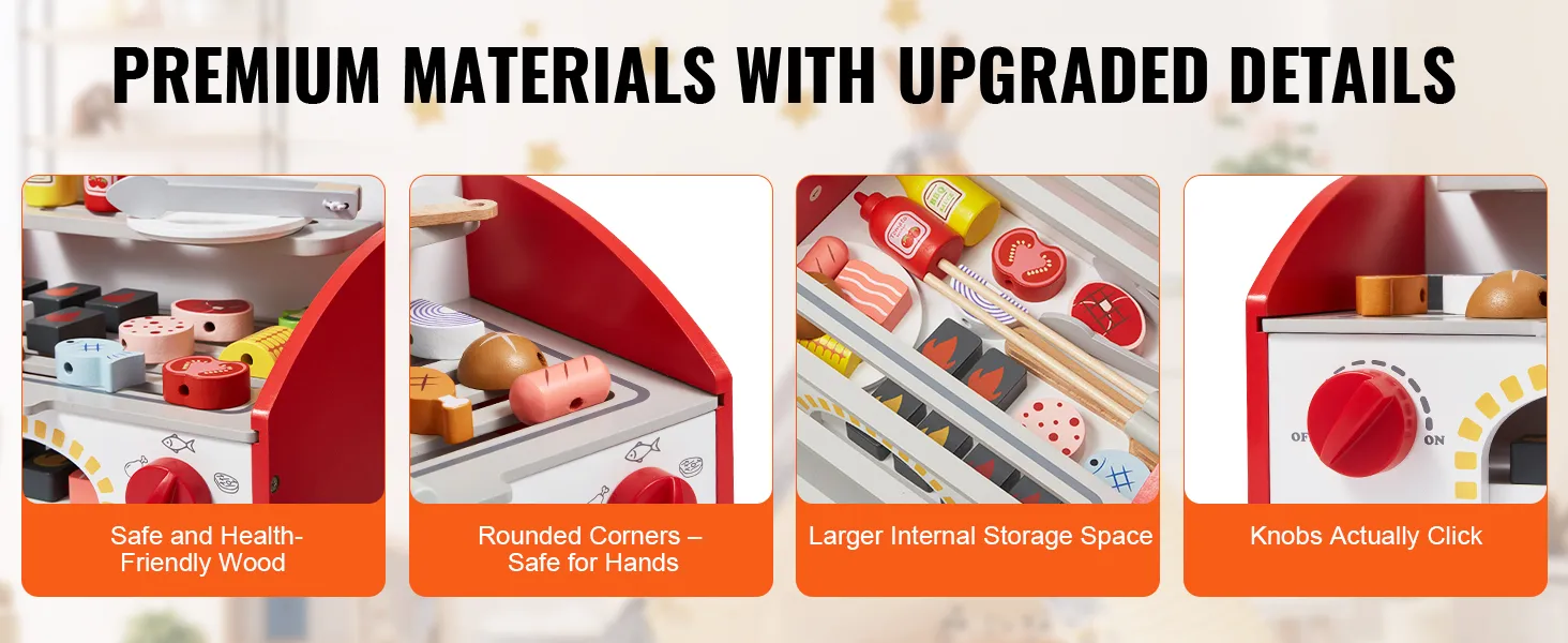 Onze kinderbarbecuespeelset is gemaakt van hoogwaardig hout en is duurzaam, glad, braamvrij en BPA-vrij. Het is een veilige keuze voor kinderen en voldoet aan alle veiligheidsnormen.