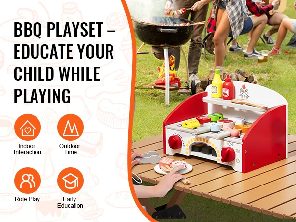 Deze speelbarbecueset is ideaal voor tuinplezier en is perfect voor buitenbarbecues met familie en vrienden. Het is ideaal voor rollenspellen, binnen- en buitenactiviteiten, vroeg leren en educatief spelen.