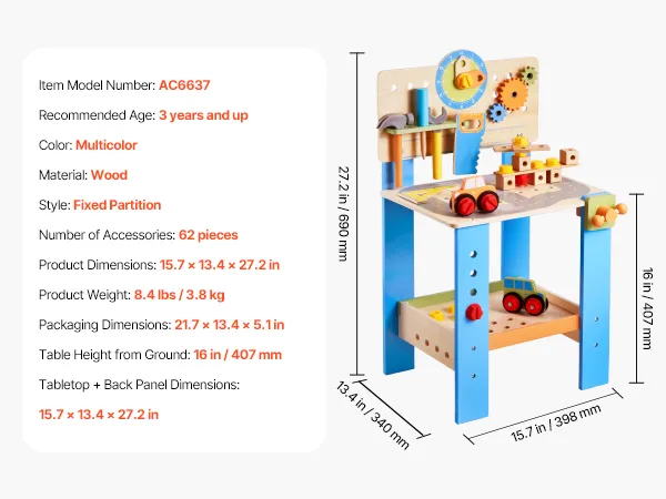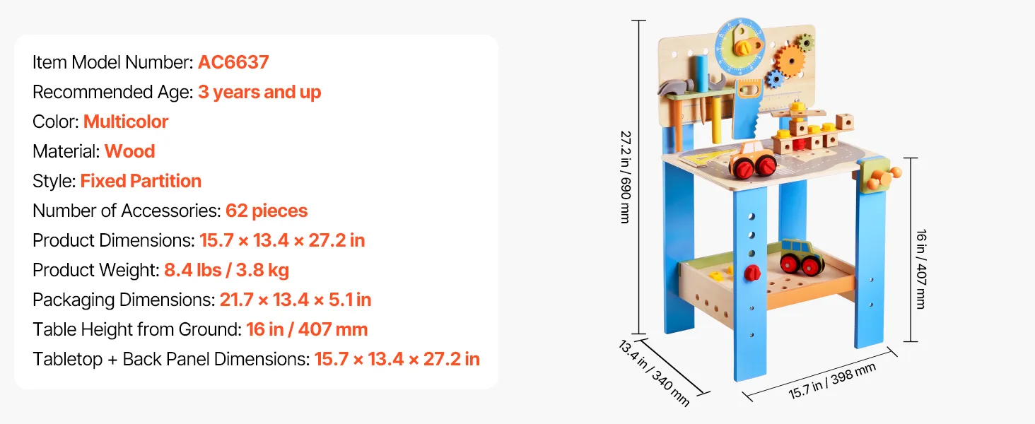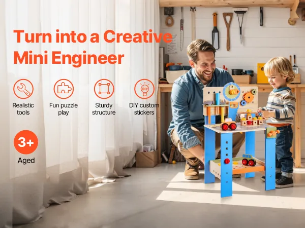 Organize and Play: At 27.7 inches tall, this workbench provides plenty of space for tools and accessories. With multifunctional holders and a large storage tray, kids can learn to keep their play area tidy while developing responsibility. A fun way to teach organizing skills and maintaining order!