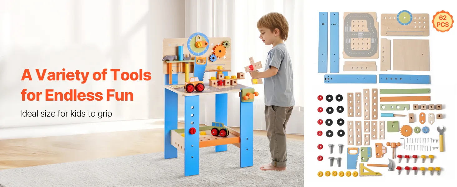 VEVOR Kids Workbench, 62 pcs, Wooden Tool Bench for Kids 3 Years and Up, Toddler Toy Workbench with Realistic Tools, Building Toy Set Creative & Educational Construction Toy for Boys & Girls