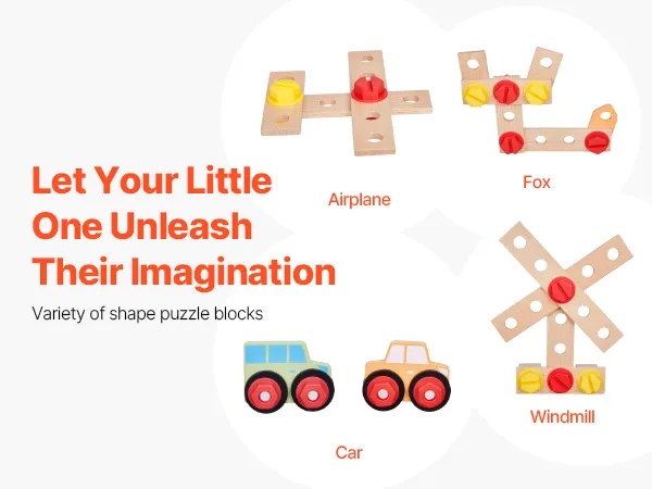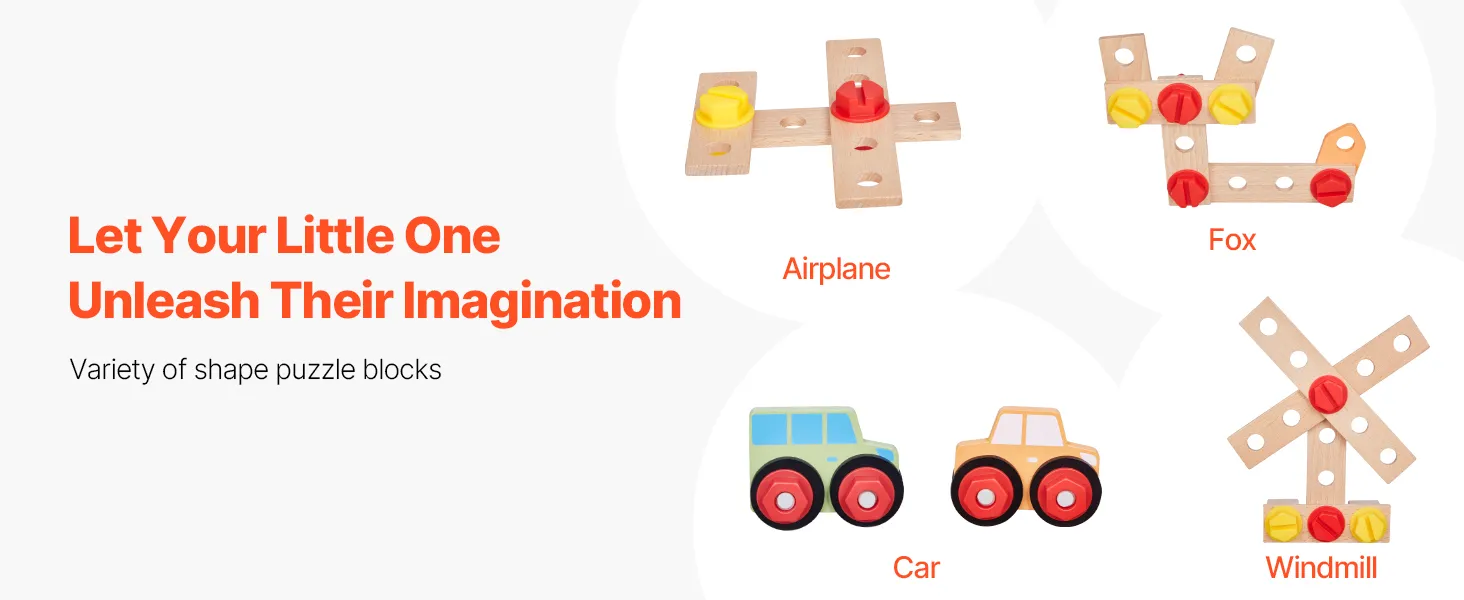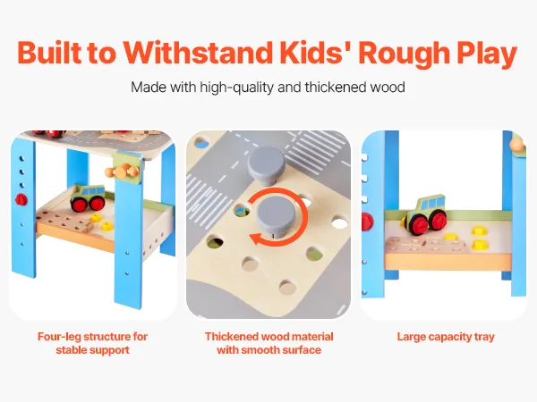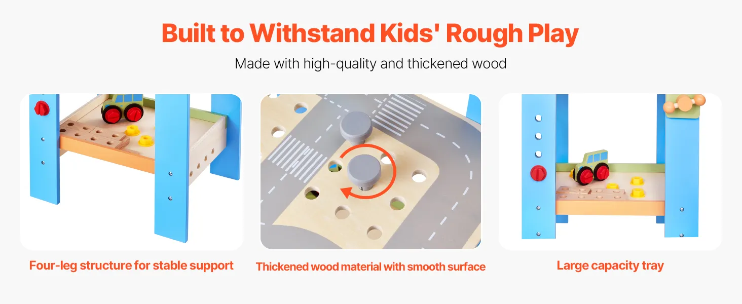 Unleash Creativity: Let your child build and play! This workbench comes with fun puzzle blocks in various shapes and a road-themed tabletop. Kids can create cars and enjoy road games while improving motor skills, problem-solving, and boosting their creativity through open-ended play.