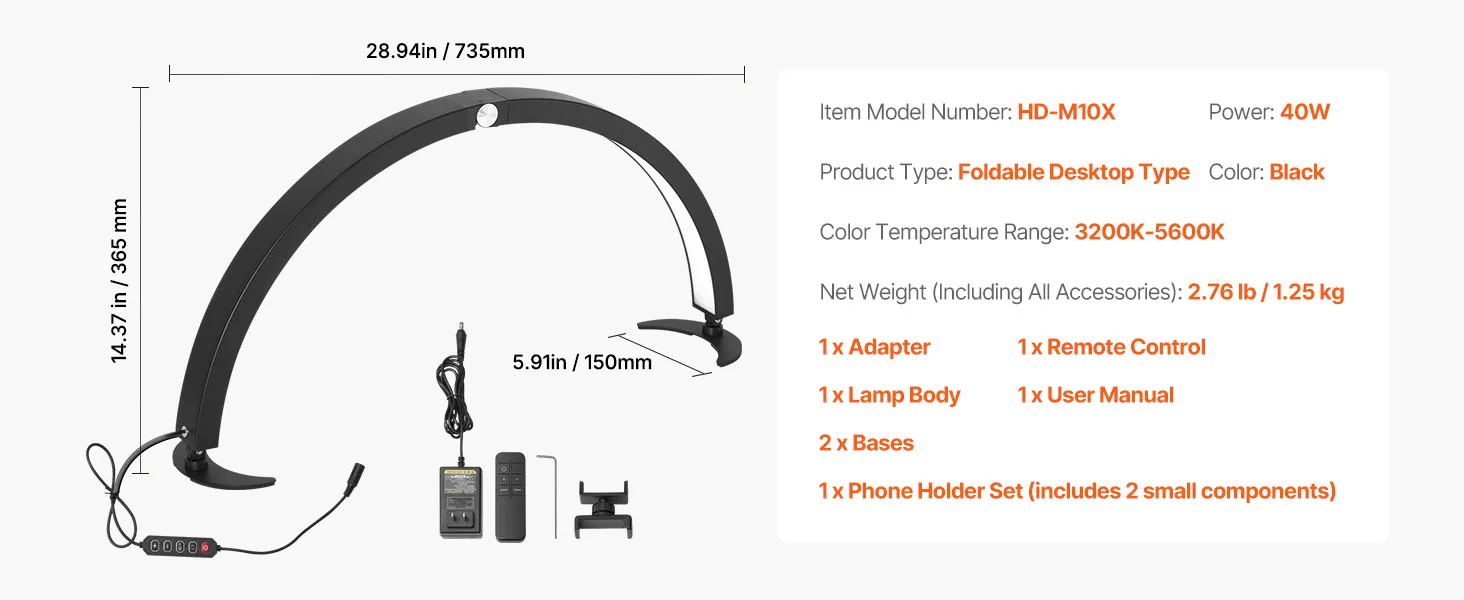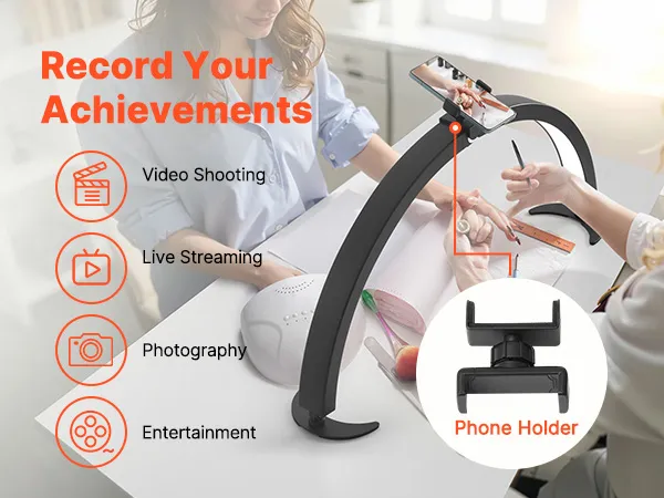 Opvouwbare halve maanlamp: De halve maan bureaulamp is opvouwbaar en eenvoudig op te bergen. Hij neemt weinig ruimte in beslag wanneer hij niet wordt gebruikt. Het halvemaanvormige ontwerp zorgt voor een gelijkmatigere verlichting, waardoor schaduwen en schitteringen worden verminderd voor een helder, vervormingsvrij beeld