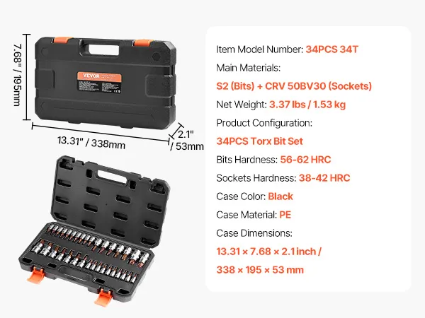 VEVOR Torx Bit Socket Set, 34-Piece Solid Star and Tamper Proof T6-T70, S2 Alloy Steel and Cr-V Steel, 1/4 in, 3/8 in, and 1/2 in Drives, with Enhanced Storage Case, Torx Sockets for Hand Use
