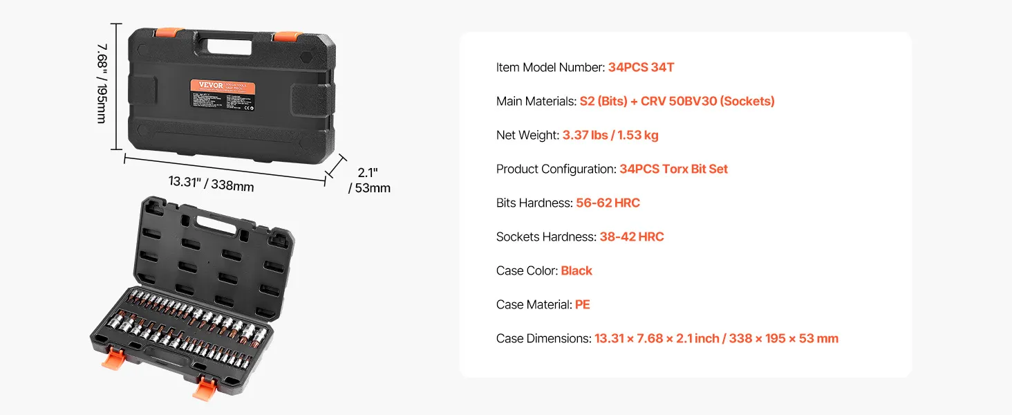 Drop-Resistant Case: Our torx set comes with a durable black PE storage case with dedicated slots for each bit socket. The secure-fit design ensures the bit sockets stay firmly in place during drops, preventing scattering, loss, or damage.