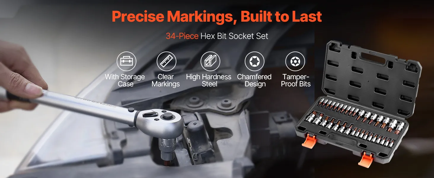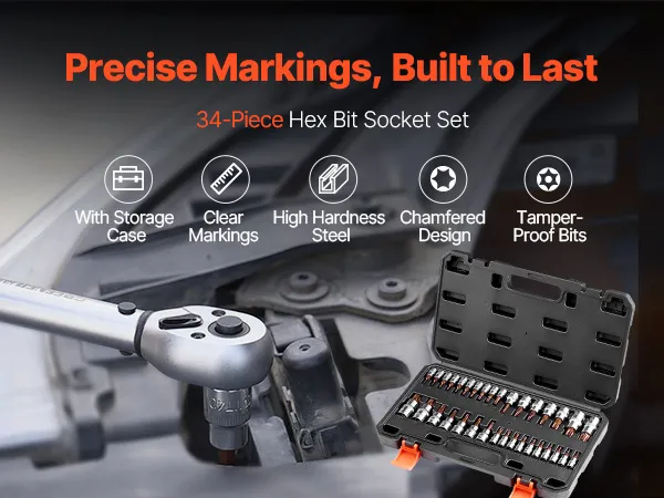 Tamper Proof Design: This 34-piece tamper-proof torx socket set includes TT6, TT7, TT8, TT9, TT10, TT15, TT20, TT25, TT27, T30 (1/4"), TT40, TT45, TT47, TT50, TT55 (3/8"), and TT60, TT70 (1/2"), covering a broad range of secure fastener needs.