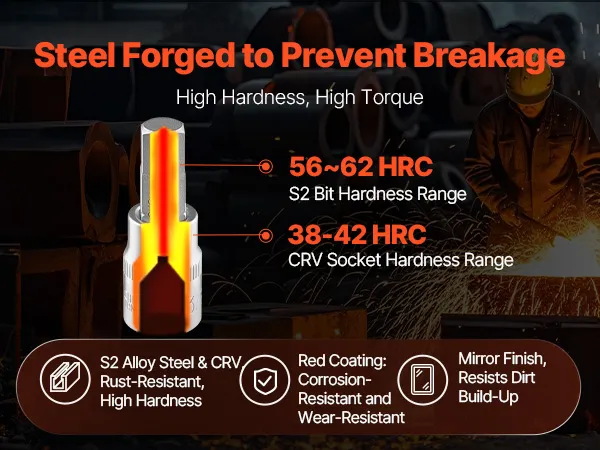Rustproof & Durable: Constructed from high-hardness S2 alloy steel and CRV chrome-plated steel, the torx bit socket set surfaces feature red coating and mirror polishing. This design resists breakage and corrosion, ensuring years of reliable use.