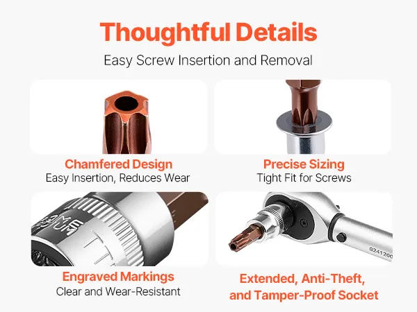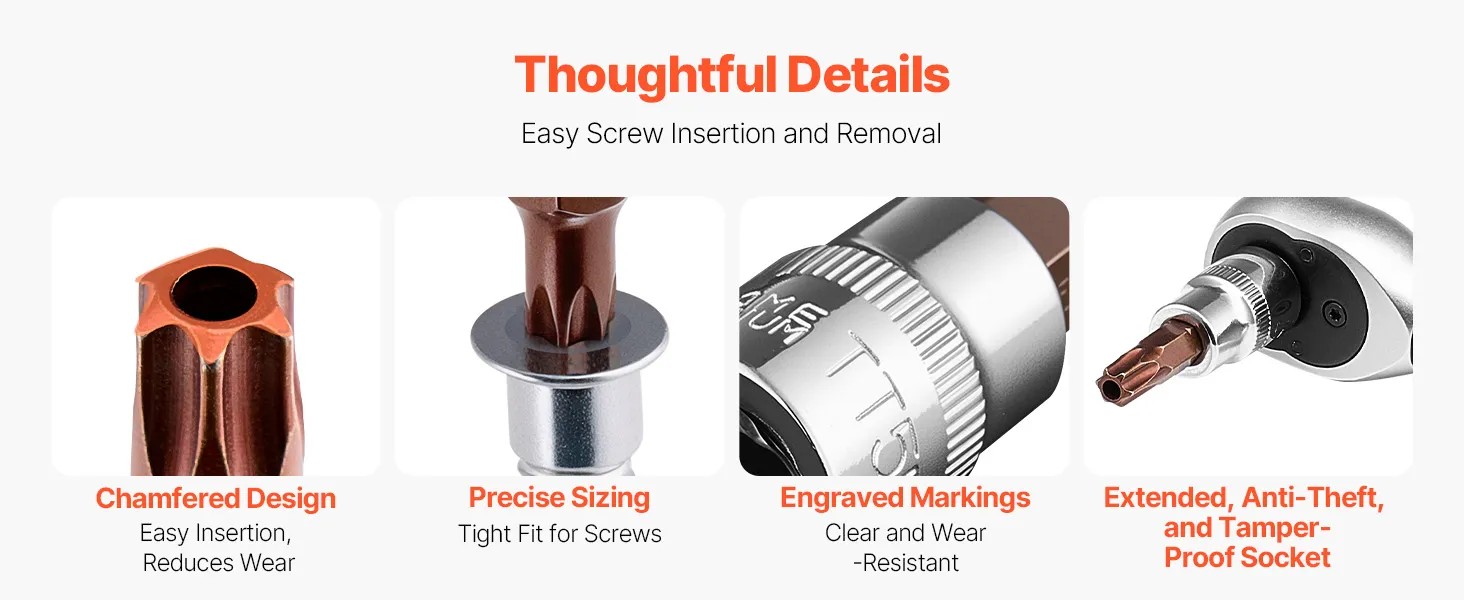The chamfered design slides in smoothly with minimal wear. Precise sizing delivers a firm grip on varied screws, while clear markings ensure quick and easy identification. Extended Torx bits reach tight spots, and tamper-proof sockets keep your work secure and streamlined.
