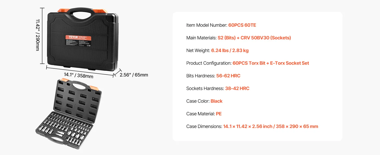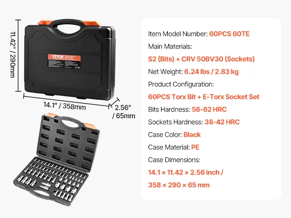 VEVOR Torx Bit Socket and External Torx Socket Set, 60-Piece T6-T70, TT6-TT70, TP8-TP60, E4-E24, S2 Alloy Steel and Cr-V Steel, 1/4 in, 3/8 in, and 1/2 in Drives, with Enhanced Storage Case, Hand Use