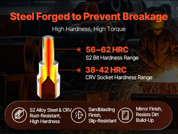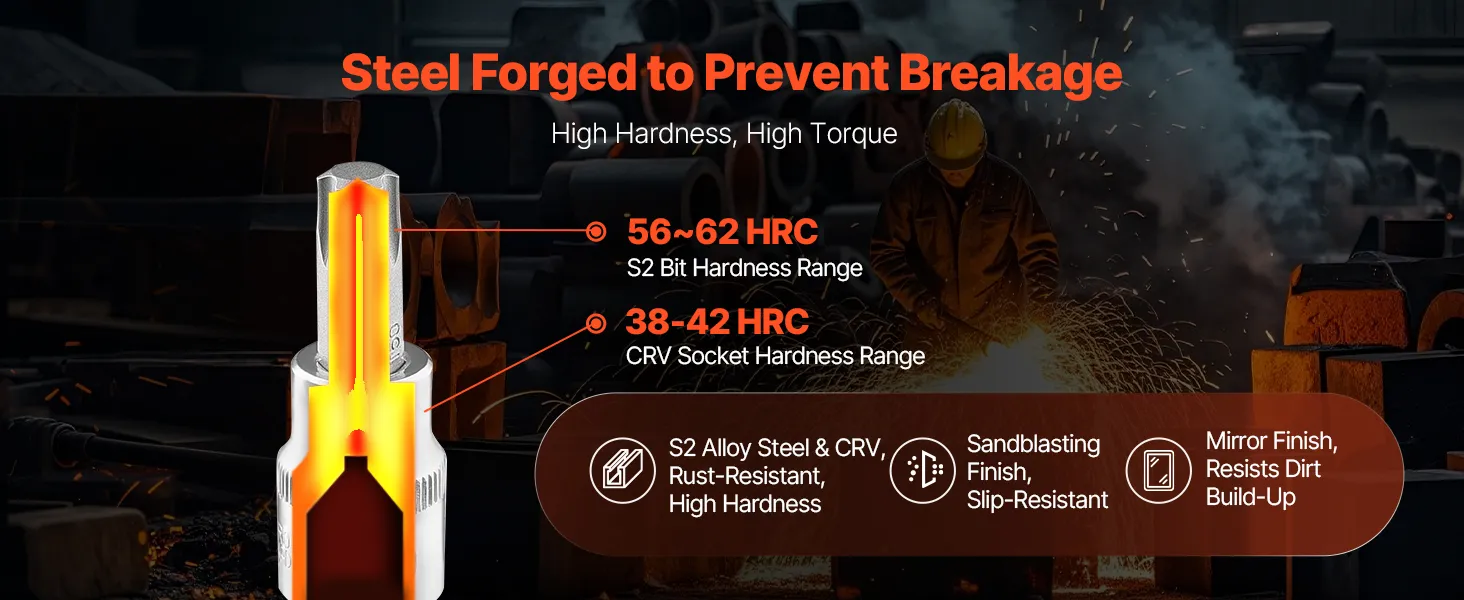 Rustproof & Durable: Constructed from high-hardness S2 alloy steel and CRV chrome-plated steel, the torx bit socket set surfaces feature sandblasting and mirror polishing. This design resists breakage and corrosion, ensuring years of reliable use.