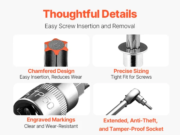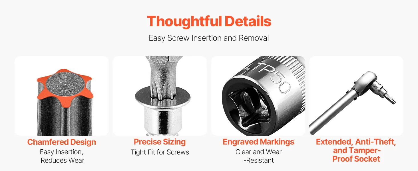 The chamfered design slides in smoothly with minimal wear. Precise sizing delivers a firm grip on varied screws, while clear markings ensure quick and easy identification. Extended Torx bits reach tight spots, and tamper-proof sockets keep your work secure and streamlined.