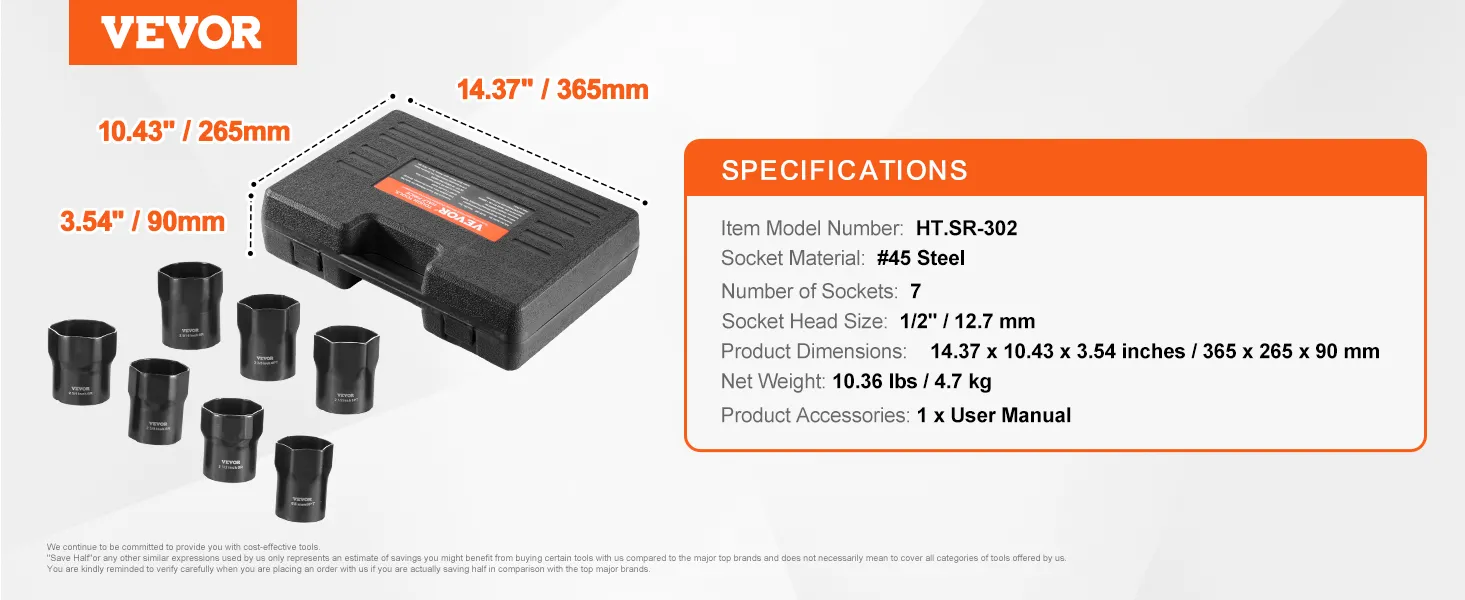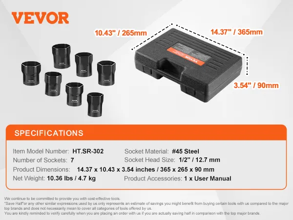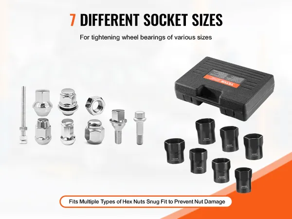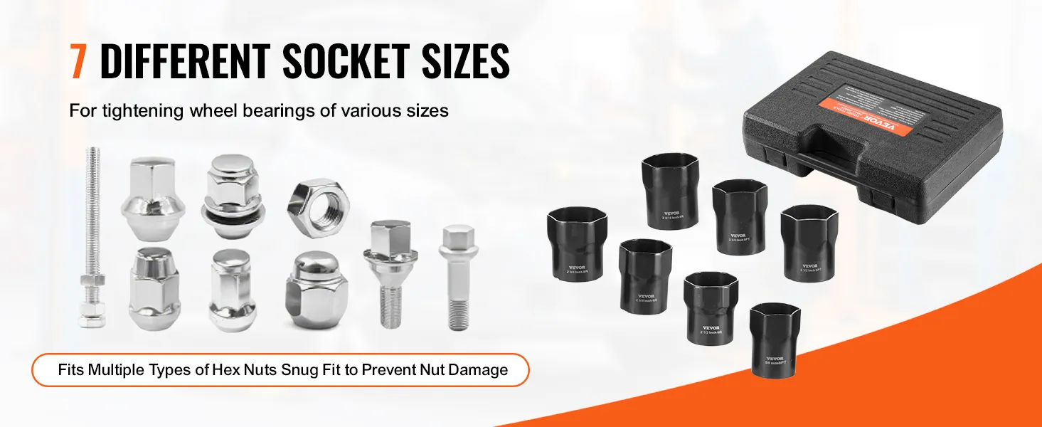 Het bevat 7 verschillende maten: 55 mm 6PT, 2 -3/8" 6R, 2 - 3/8" 6PT, 2 1/2" 6R, 2 -1/2" 6PT, 2 - 9/16" 6R en 2 - 3/4 inch 6R. Het is geschikt voor een groot aantal zeskantmoeren en zorgt ervoor dat wiellagers efficiënt kunnen worden vastgedraaid.