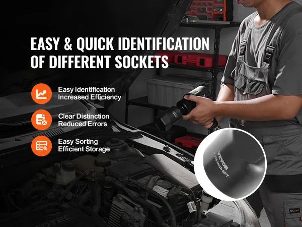 Het heeft een gekleurd oppervlak dat het gemakkelijker maakt om de verschillende maten dopsleutels te identificeren en de werkefficiëntie te verbeteren. Tegelijkertijd vermindert het duidelijke onderscheid werkfouten en zorgt het voor een gemakkelijke categorisering en efficiënte opslag.