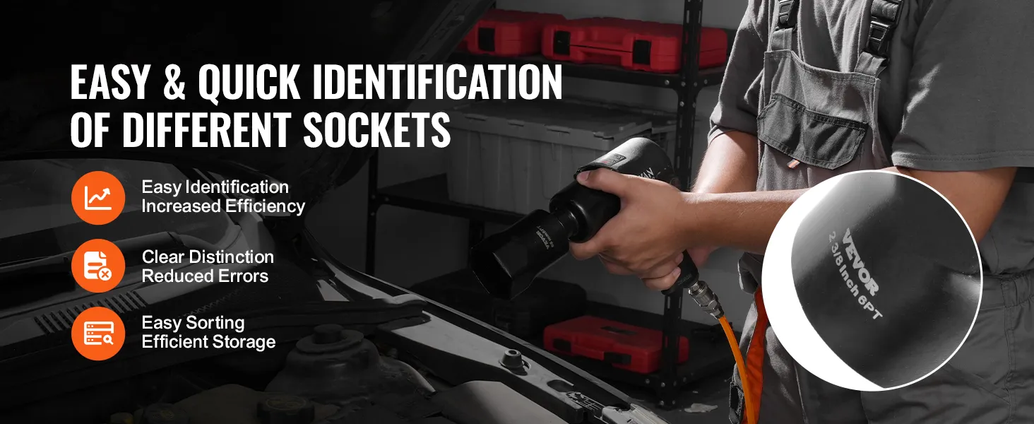 Slagvast en corrosiebestendig: de slagmoersleutelset is gemaakt van warmtebehandeld CR-MO-staal en is bestand tegen het hoge koppel van slaggereedschap. De duidelijke kleurmarkeringen zorgen voor een snelle identificatie van de maten, zelfs bij weinig licht.