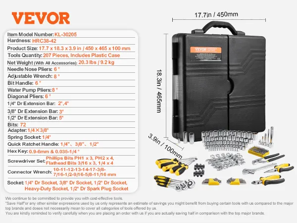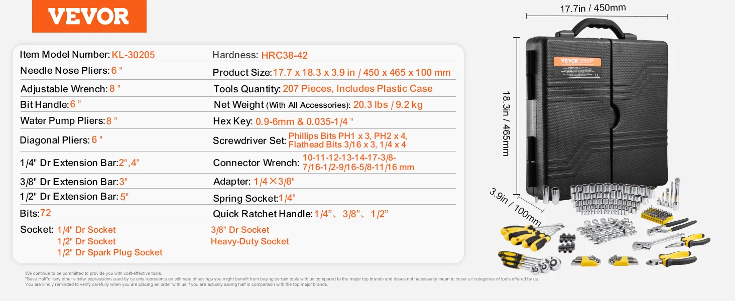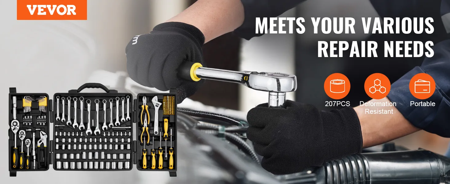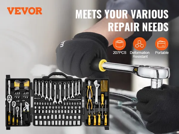 Ultimate Compatibility: This 207-piece mechanics tool set includes SAE and metric sizes of 1/2", 3/8", and 1/4" drive sockets, ratchet handles, hex wrenches, extension bars, bits, screwdrivers and pliers, making it perfect for handling complex repair jobs.